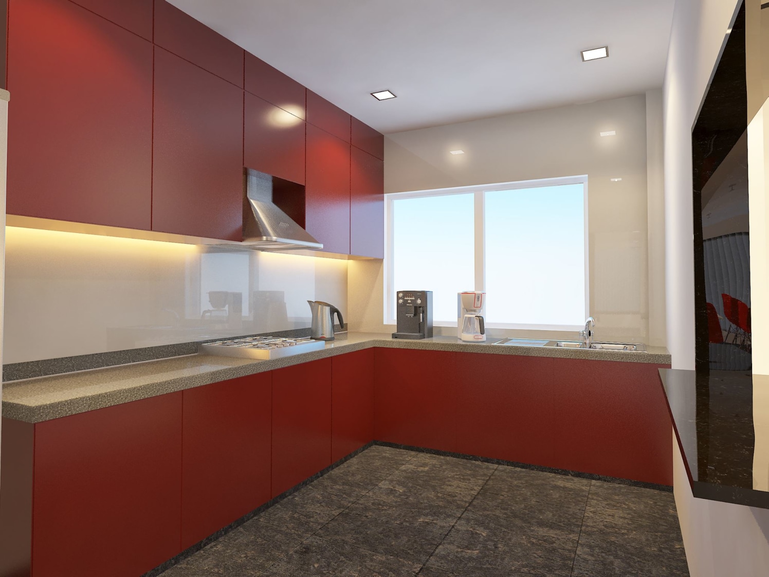Elegant Modular Kitchen with Red Cabinets and Grey Counter