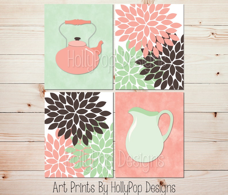 Kitchen Decor Peach Mint Green Brown Kitchen Wall Art